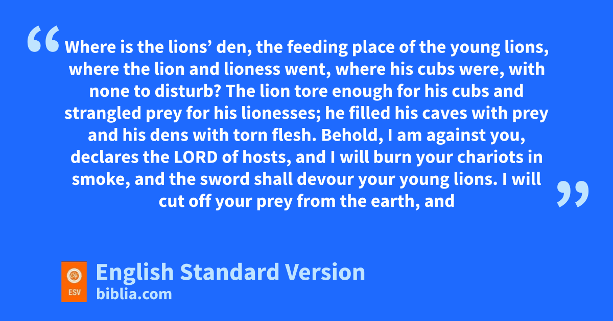 13 mBehold, I am against you, declares the Lord of hosts, and nI will burn your6 chariots in smoke, and the sword shall devour your young lions. I will cut off your prey from the earth, and othe voice of your messengers shall no longer be heard.