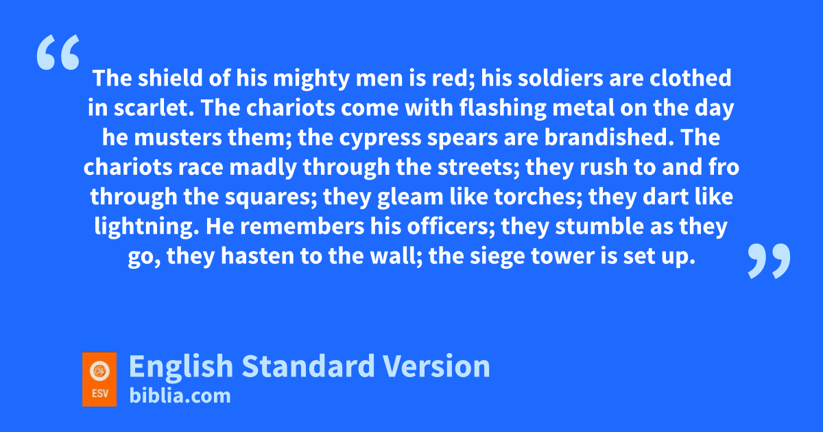 13 mBehold, I am against you, declares the Lord of hosts, and nI will burn your6 chariots in smoke, and the sword shall devour your young lions. I will cut off your prey from the earth, and othe voice of your messengers shall no longer be heard.