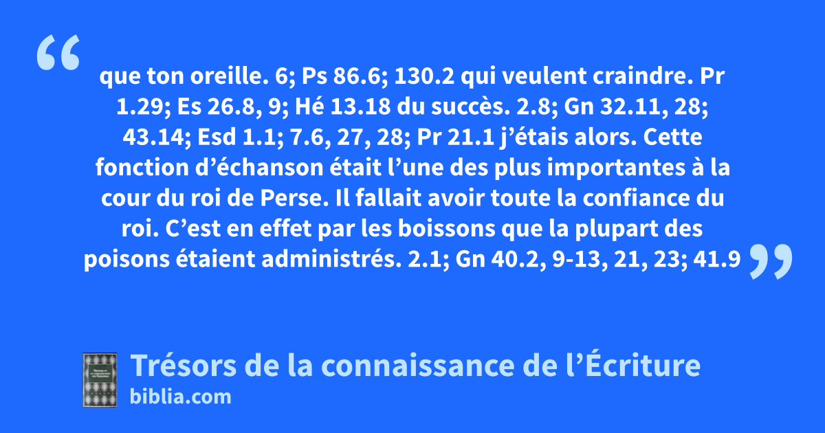 que ton oreille. 6; Ps 86.6; 130.2 qui veulent craindre. Pr 1.29; Es 26.8, 9; Hé 13.18 du succès. 2.8; Gn 32.11, 28; 43.14; Esd 1.1; 7.6, 27, 28; Pr 21.1 j’étais alors. Cette fonction d’échanson était l’une des plus importantes à la cour du roi de Perse. Il fallait avoir toute la confiance du roi. C’est en effet par les boissons que la plupart des poisons étaient administrés. 2.1; Gn 40.2, 9-13, 21, 23; 41.9