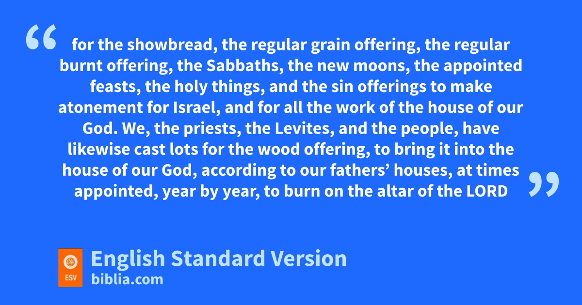 32 “We also take on ourselves the obligation to give yearly ua third part of a shekel3 for the service of the house of our God: 33 vfor the showbread, wthe regular grain offering, wthe regular burnt offering, the Sabbaths, the new moons, the appointed feasts, the holy things, and the sin offerings to make atonement for Israel, and for all the work of the house of our God. 34 xWe, the priests, the Levites, and the people, have likewise cast lots yfor the wood offering, to bring it into the house of our God, according to our fathers’ houses, at times appointed, year by year, to burn on the altar of the Lord our God, zas it is written in the Law. 35 We obligate ourselves ato bring the firstfruits of our ground and the firstfruits of all fruit of every tree, year by year, to the house of the Lord; 36 also to bring to the house of our God, to the priests who minister in the house of our God, the firstborn of our sons and of our cattle, bas it is written in the Law, and the firstborn of our herds and of our flocks; 37 cand to bring the first of our dough, and our contributions, the fruit of every tree, the wine and the oil, to the priests, dto the chambers of the house of our God; and to bring to the Levites the tithes from our ground, for it is the Levites who collect the tithes in all our towns where we labor. 38 And the priest, the son of Aaron, shall be with the Levites when the Levites receive the tithes. And the Levites shall bring up the tithe of the tithes to the house of our God, to the chambers of ethe storehouse. 39 For the people of Israel and the sons of Levi fshall bring the contribution of grain, wine, and oil to the chambers, where the vessels of the sanctuary are, as well as the priests who minister, and the gatekeepers and the singers. gWe will not neglect the house of our God.”