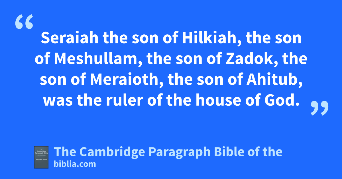 10 lOf the priests: mJedaiah nthe son of Joiarib, Jachin, 11 oSeraiah the son of Hilkiah, the son of Meshullam, the son of Zadok, the son of Meraioth, the son of Ahitub, was the ruler of the house of God. 12 And their brethren that did the work of the house were eight hundred twenty and two: and pAdaiah the son of Jeroham, the son of Pelaliah, the son of Amzi, the son of Zechariah, the son of qPashur, the son of Malchiah, 13 and his brethren, chief of the fathers, two hundred forty and two: and rAmashai the son of Azareel, the son of Ahasai, the son of Meshillemoth, the son of Immer, 14 and their brethren, mighty men of valour, an hundred twenty and eight: and their overseer was Zabdiel, * the son of one of the great men.