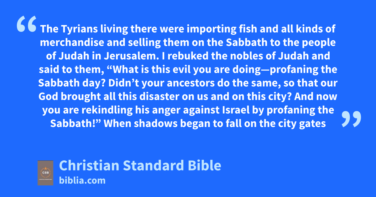 17 I rebuked the nobles of Judah and said to them, “What is this evil you are doing—profaning the Sabbath day?b 18 Didn’t your ancestors do the same, so that our God brought all this disaster on us and on this city?c And now you are rekindling his anger against Israel by profaning the Sabbath!”