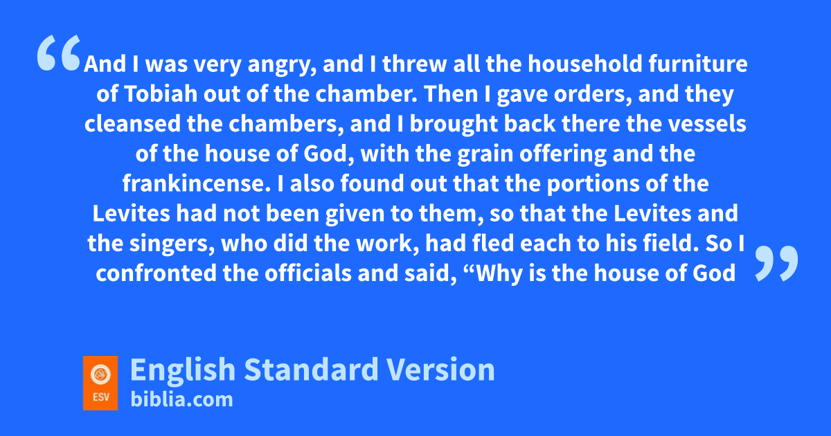 4 Now before this, vEliashib the priest, who wwas appointed over the chambers of the house of our God, and who was related to xTobiah, 5 prepared for Tobiah a large chamber where they had previously put the grain offering, the frankincense, the vessels, and the tithes of grain, wine, and oil, ywhich were given by commandment to the Levites, singers, and gatekeepers, and the contributions for the priests. 6 While this was taking place, I was not in Jerusalem, for zin the thirty-second year of Artaxerxes aking of Babylon I went to the king. And after some time I asked leave of the king 7 and came to Jerusalem, and I then discovered the evil that Eliashib had done for Tobiah, bpreparing for him a chamber in the courts of the house of God. 8 And I was very angry, and I threw all the household furniture of Tobiah out of the chamber. 9 Then I gave orders, and they ccleansed the chambers, and I brought back there the vessels of the house of God, with the grain offering and the frankincense.