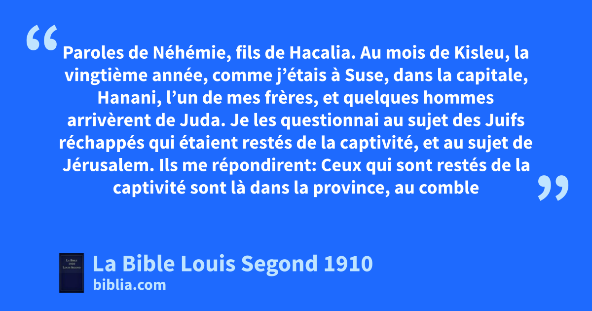 1Paroles de Néhémie, fils de Hacalia. Au mois de Kisleu, la vingtième année, comme j’étais à Suse, dans la capitale, 2Hanani, l’un de mes frères, et quelques hommes arrivèrent de Juda. Je les questionnai au sujet des Juifs réchappés qui étaient restés de la captivité, et au sujet de Jérusalem. 3Ils me répondirent: Ceux qui sont restés de la captivité sont là dans la province, au comble du malheur et de l’opprobre; les murailles de Jérusalem sont en ruines, et ses portes sont consumées par le feu. 4Lorsque j’entendis ces choses, je m’assis, je pleurai, et je fus plusieurs jours dans la désolation. Je jeûnai et je priai devant le Dieu des cieux, 5et je dis: aO Éternel, Dieu des cieux, Dieu grand et redoutable, btoi qui gardes ton alliance et qui fais miséricorde à ceux qui t’aiment et qui observent tes commandements! 6Que ton oreille soit attentive et que tes yeux soient ouverts: écoute la prière que ton serviteur t’adresse en ce moment, jour et nuit, pour tes serviteurs les enfants d’Israël, en confessant les péchés des enfants d’Israël, nos péchés contre toi; car moi et la maison de mon père, nous avons péché. 7Nous t’avons offensé, et nous n’avons point observé les commandements, les lois et les ordonnances que tu prescrivis à Moïse, ton serviteur. 8Souviens-toi de cette cparole que tu donnas ordre à Moïse, ton serviteur, de prononcer. Lorsque vous pécherez, je vous disperserai parmi les peuples; 9mais si vous revenez à moi, et si vous observez mes commandements et les mettez en pratique, alors, quand vous seriez exilés à l’extrémité du ciel, de là je vous rassemblerai et je vous ramènerai dans le lieu que j’ai choisi pour y faire résider mon nom. 10Ils sont tes serviteurs et ton peuple, que tu as rachetés par ta grande puissance et par ta main forte. 11Ah! Seigneur, que ton oreille soit attentive à la prière de ton serviteur, et à la prière de tes serviteurs qui veulent craindre ton nom! Donne aujourd’hui du succès à ton serviteur, et fais-lui trouver grâce devant cet homme! J’étais alors échanson du roi.
