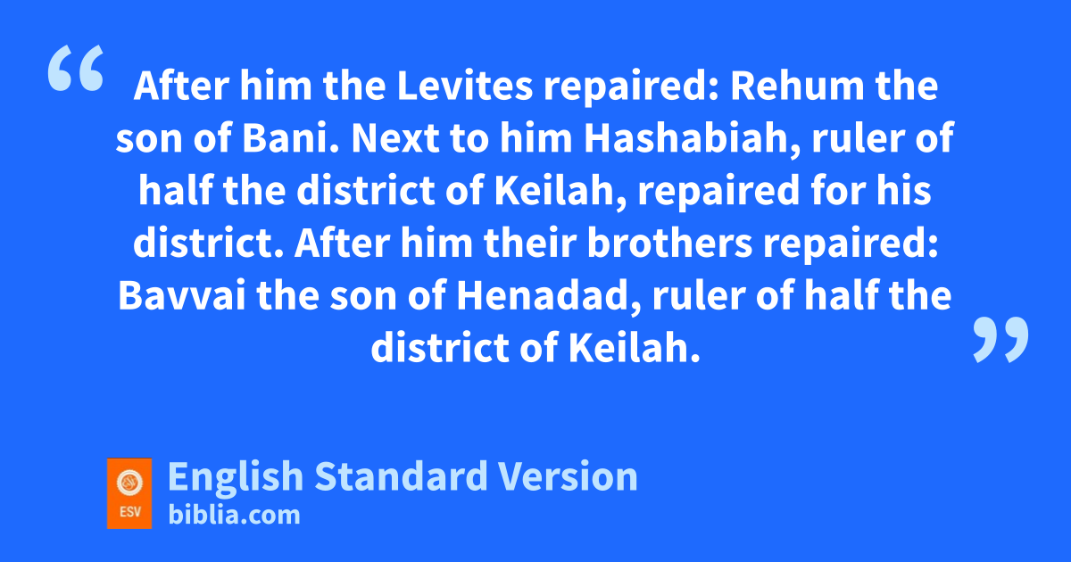 15 And Shallum the son of Col-hozeh, ruler of the district of Mizpah, repaired vthe Fountain Gate. He rebuilt it and covered it and sset its doors, its bolts, and its bars. And he built the wall of wthe Pool of Shelah of xthe king’s garden, as far as ythe stairs that go down from the city of David. 16 After him Nehemiah the son of Azbuk, ruler of half the district of Beth-zur, repaired to a point opposite zthe tombs of David, as far as athe artificial pool, and as far as the house of the mighty men. 17 After him the Levites repaired: Rehum the son of Bani. Next to him Hashabiah, ruler of half the district of Keilah, repaired for his district. 18 After him their brothers repaired: Bavvai the son of Henadad, ruler of half the district of Keilah. 19 Next to him Ezer the son of Jeshua, ruler of Mizpah, repaired another section opposite the ascent to the armory at bthe buttress.6 20 After him Baruch the son of Zabbai repaired7 another section from the buttress to the door of the house of cEliashib the high priest. 21 After him dMeremoth the son of Uriah, son of Hakkoz repaired another section from the door of the house of Eliashib to the end of the house of Eliashib. 22 After him the priests, the men of ethe surrounding area, repaired. 23 After them Benjamin and Hasshub repaired opposite their house. After them Azariah the son of Maaseiah, son of Ananiah repaired beside his own house. 24 After him Binnui the son of Henadad repaired another section, from the house of Azariah to the buttress and to fthe corner.25 Palal the son of Uzai repaired opposite the buttress and the tower projecting from the upper house of the king at gthe court of the guard. After him Pedaiah the son of Parosh 26 hand the temple servants living on iOphel repaired to a point opposite jthe Water Gate on the east and the projecting tower. 27 After him kthe Tekoites repaired another section opposite the great projecting tower as far as the wall of Ophel.