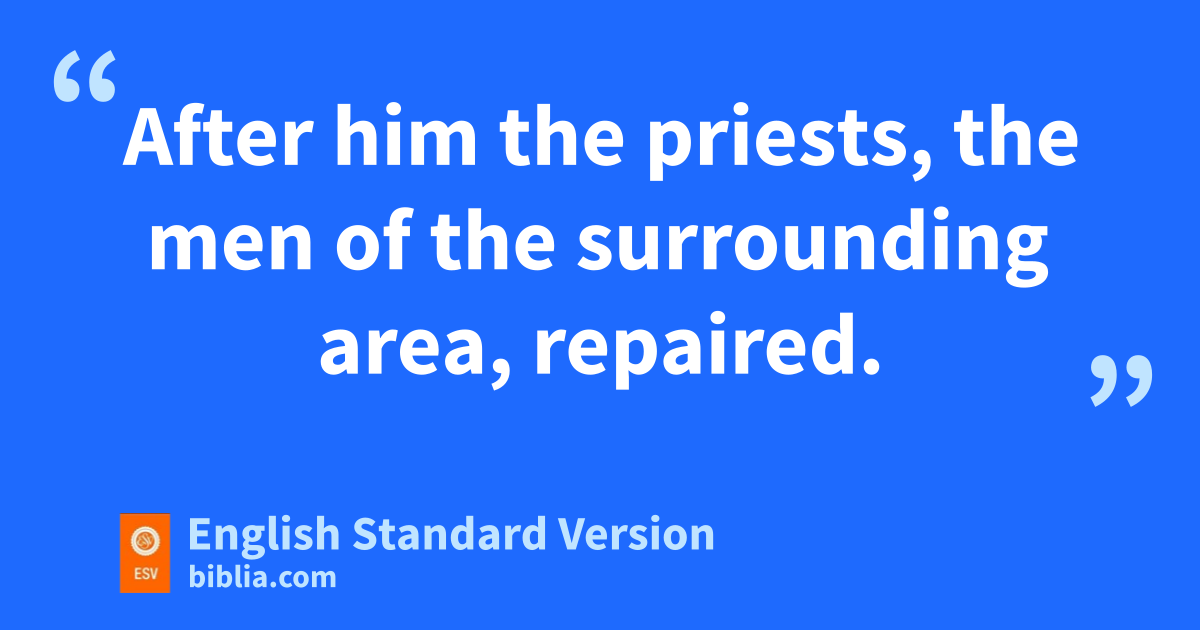 15 And Shallum the son of Col-hozeh, ruler of the district of Mizpah, repaired vthe Fountain Gate. He rebuilt it and covered it and sset its doors, its bolts, and its bars. And he built the wall of wthe Pool of Shelah of xthe king’s garden, as far as ythe stairs that go down from the city of David. 16 After him Nehemiah the son of Azbuk, ruler of half the district of Beth-zur, repaired to a point opposite zthe tombs of David, as far as athe artificial pool, and as far as the house of the mighty men. 17 After him the Levites repaired: Rehum the son of Bani. Next to him Hashabiah, ruler of half the district of Keilah, repaired for his district. 18 After him their brothers repaired: Bavvai the son of Henadad, ruler of half the district of Keilah. 19 Next to him Ezer the son of Jeshua, ruler of Mizpah, repaired another section opposite the ascent to the armory at bthe buttress.6 20 After him Baruch the son of Zabbai repaired7 another section from the buttress to the door of the house of cEliashib the high priest. 21 After him dMeremoth the son of Uriah, son of Hakkoz repaired another section from the door of the house of Eliashib to the end of the house of Eliashib. 22 After him the priests, the men of ethe surrounding area, repaired. 23 After them Benjamin and Hasshub repaired opposite their house. After them Azariah the son of Maaseiah, son of Ananiah repaired beside his own house. 24 After him Binnui the son of Henadad repaired another section, from the house of Azariah to the buttress and to fthe corner.25 Palal the son of Uzai repaired opposite the buttress and the tower projecting from the upper house of the king at gthe court of the guard. After him Pedaiah the son of Parosh 26 hand the temple servants living on iOphel repaired to a point opposite jthe Water Gate on the east and the projecting tower. 27 After him kthe Tekoites repaired another section opposite the great projecting tower as far as the wall of Ophel.