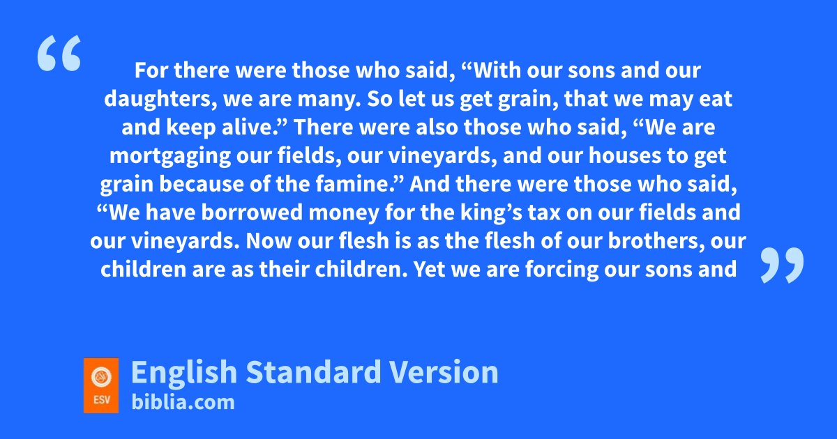 5 Now there arose fa great outcry of the people and of their wives gagainst their Jewish brothers. 2 For there were those who said, “With our sons and our daughters, we are many. So let us get grain, that we may eat and keep alive.” 3 There were also those who said, “We are mortgaging our fields, our vineyards, and our houses to get grain because of the famine.” 4 And there were those who said, “We have borrowed money for hthe king’s tax on our fields and our vineyards. 5 Now iour flesh is as the flesh of our brothers, our children are as their children. Yet jwe are forcing our sons and our daughters to be slaves, and some of our daughters have already been enslaved, but it is not in our power to help it, for other men have our fields and our vineyards.”