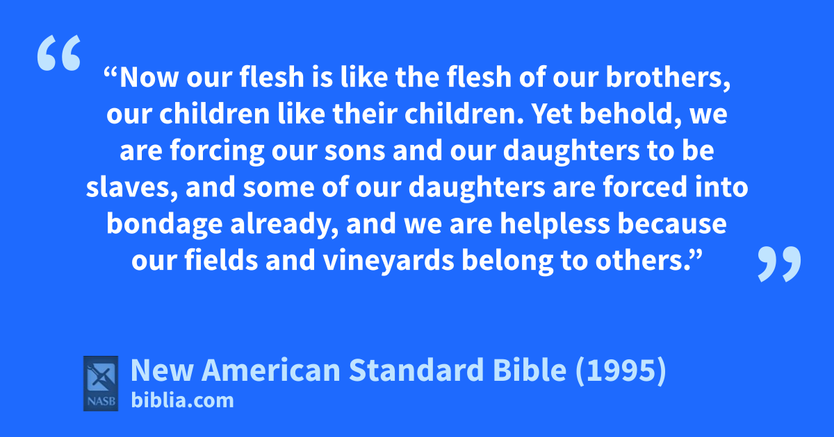 5 “Now aour flesh is like the flesh of our brothers, our children like their children. Yet behold, bwe are forcing our sons and our daughters to be slaves, and some of our daughters are forced into bondage already, and 1we are helpless because our fields and vineyards belong to others.”