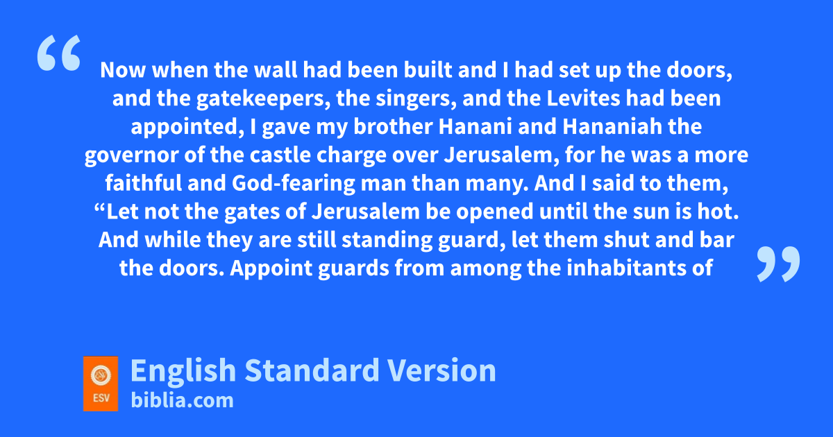7 Now when the wall had been built nand I had set up the doors, and the gatekeepers, the singers, and the Levites had been appointed, 2 I gave omy brother Hanani and Hananiah the governor of pthe castle charge over Jerusalem, for he was qa more faithful and God-fearing man than many. 3 And I said to them, “Let not the gates of Jerusalem be opened until the sun is hot. And while they are still standing guard, let them shut and bar the doors. Appoint guards from among the inhabitants of Jerusalem, some at their guard posts and some in front of their own homes.” 4 The city was wide and large, but the people within it were few, and no houses had been rebuilt.