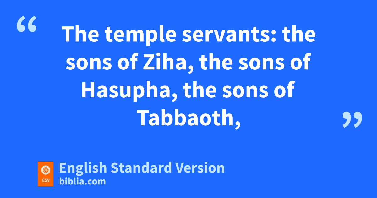 46 The temple servants: the sons of Ziha, the sons of Hasupha, the sons of Tabbaoth, 47 the sons of Keros, the sons of hSia, the sons of Padon, 48 the sons of Lebana, the sons of iHagaba, the sons of iShalmai, 49 the sons of Hanan, the sons of Giddel, the sons of Gahar, 50 the sons of Reaiah, the sons of Rezin, the sons of Nekoda, 51 the sons of Gazzam, the sons of Uzza, the sons of Paseah, 52 the sons of Besai, the sons of Meunim, the sons of jNephushesim, 53 the sons of Bakbuk, the sons of Hakupha, the sons of Harhur, 54 the sons of kBazlith, the sons of Mehida, the sons of Harsha, 55 the sons of Barkos, the sons of Sisera, the sons of Temah, 56 the sons of Neziah, the sons of Hatipha.