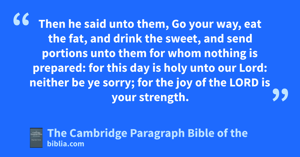 9 And Nehemiah, which is * the Tirshatha, and Ezra the priest the scribe, and the Levites gthat taught the people, said unto all the people, hThis day is holy unto the Lord your God; imourn not, nor weep. For all the people wept, when they heard the words of the law. 10 Then he said unto them, Go your way, eat the fat, and drink the sweet, and send portions unto them for whom nothing is prepared: for this day is holy unto our Lord: neither be ye sorry; for the joy of the Lord is your strength. 11 So the Levites stilled all the people, saying, Hold your peace, for the day is holy; neither be ye grieved. 12 And all the people went their way to eat, and to drink, and to jsend portions, and to make great mirth, because they had kunderstood the words that were declared unto them. 13 And on the second day lwere gathered together the chief of the fathers of all the people, the priests, and the Levites, unto Ezra the scribe, even * to understand the words of the law. 14 And they found written in the law which the Lord had commanded * by Moses, that the children of Israel should dwell in mbooths in the feast of the seventh month: 15 and that they should npublish and proclaim in all their cities, and oin Jerusalem, saying, Go forth unto the mount, and fetch olive branches, and ppine branches, and myrtle branches, and qpalm branches, and branches of qthick trees, to make booths, as it is written. 16 So the people went forth, and brought them, and made themselves booths, every one upon rthe roof of his house, and in their courts, and in the courts of the house of God, and in sthe street of the water gate, and in the street of the tgate of Ephraim. 17 And all the congregation of them that were come again out of the captivity made booths, and sat under the booths: for since the days of Jeshua the son of Nun unto that day uhad not the children of Israel done so. And there was very xgreat gladness. 18 Also day by day, from the first day unto the last day, yhe read in the book of the law of God. And they kept the feast seven days; and on the eighth day was * a solemn assembly, according unto the manner.
