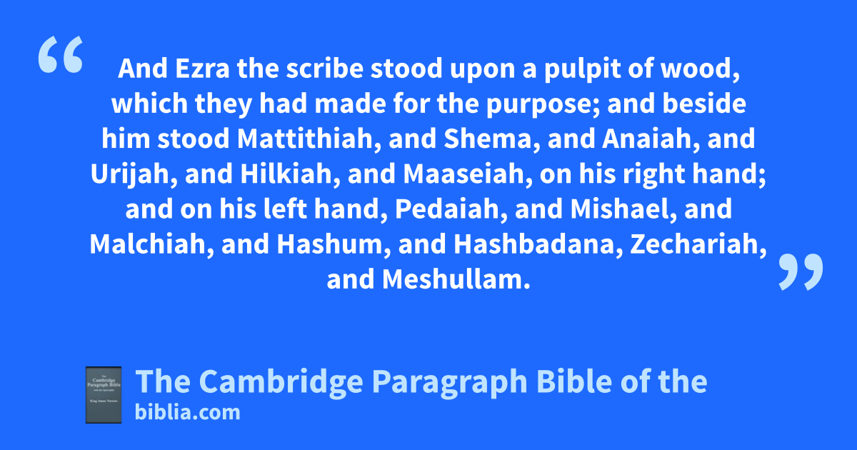 VIII. * And all the people agathered themselves together as one man into the street that was before the bwater gate; and they spake unto Ezra the cscribe to bring the book of the law of Moses, which the Lord had commanded to Israel. 2 And Ezra the priest brought dthe law before the congregation both of men and women, and all * that could hear with understanding, upon ethe first day of the seventh month. 3 And dhe read therein before the street that was before the bwater gate * from the morning until midday, before the men and the women, and those that could understand; and the ears of all the people were attentive unto the book of the law. 4 And Ezra the scribe stood upon a * pulpit of wood, which they had made for the purpose; and beside him stood fMattithiah, and Shema, and gAnaiah, and hUrijah, and Hilkiah, and iMaaseiah, on his right hand; and on his left hand, Pedaiah, and Mishael, and kMalchiah, and lHashum, and Hashbadana, mZechariah, and mMeshullam. 5 And Ezra opened the book in the * sight of all the people; (for nhe was above all the people;) and when he opened it, all the people stood up: 6 and Ezra oblessed the Lord, the great God. And all the people answered, pAmen, Amen, with qlifting up their hands: and they rbowed their heads, and worshipped the Lord with their faces to the ground. 7 Also sJeshua, and tBani, and uSherebiah, Jamin, Akkub, xShabbethai, yHodijah, iMaaseiah, zKelita, aAzariah, bJozabad, cHanan, cPelaiah, and the Levites, dcaused the people to understand the law: and the people estood in their place. 8 So they read in the book in the law of God fdistinctly, and gave the sense, and caused them to understand the reading.