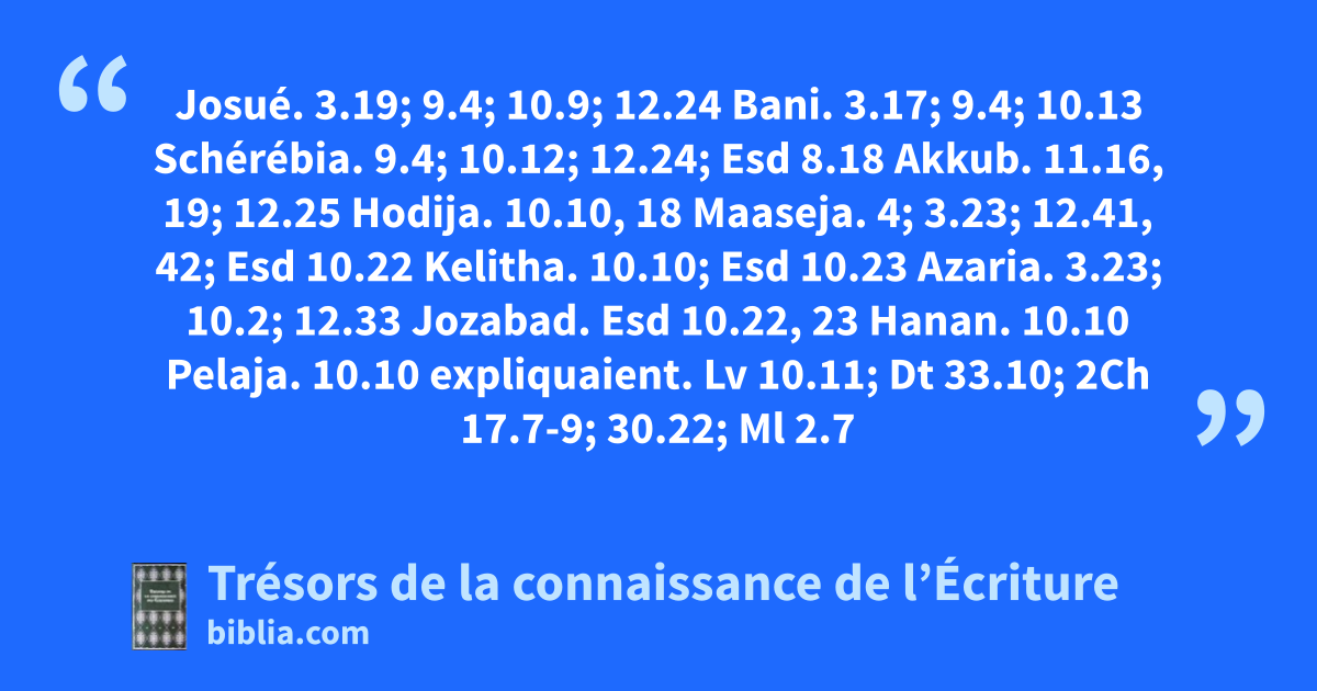 Josué. 3.19; 9.4; 10.9; 12.24 Bani. 3.17; 9.4; 10.13 Schérébia. 9.4; 10.12; 12.24; Esd 8.18 Akkub. 11.16, 19; 12.25 Hodija. 10.10, 18 Maaseja. 4; 3.23; 12.41, 42; Esd 10.22 Kelitha. 10.10; Esd 10.23 Azaria. 3.23; 10.2; 12.33 Jozabad. Esd 10.22, 23 Hanan. 10.10 Pelaja. 10.10 expliquaient. Lv 10.11; Dt 33.10; 2Ch 17.7-9; 30.22; Ml 2.7