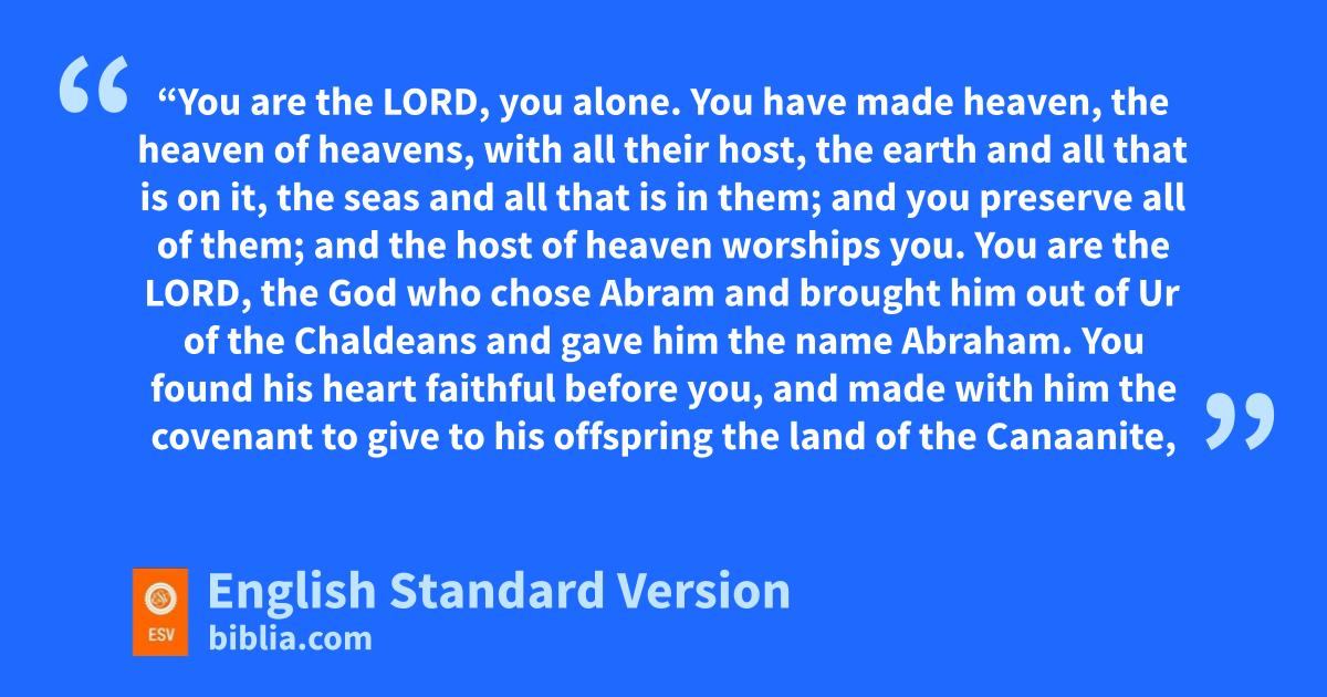 6 2 d“You are the Lord, you alone. eYou have made heaven, fthe heaven of heavens, gwith all their host, ethe earth and all that is on it, the seas and all that is in them; hand you preserve all of them; and the host of heaven worships you. 7 You are the Lord, the God iwho chose Abram and brought him out of jUr of the Chaldeans kand gave him the name Abraham. 8 lYou found his heart faithful before you, mand made with him the covenant to give to his offspring nthe land of the Canaanite, the Hittite, the Amorite, the Perizzite, the Jebusite, and the Girgashite. oAnd you have kept your promise, for you are righteous.