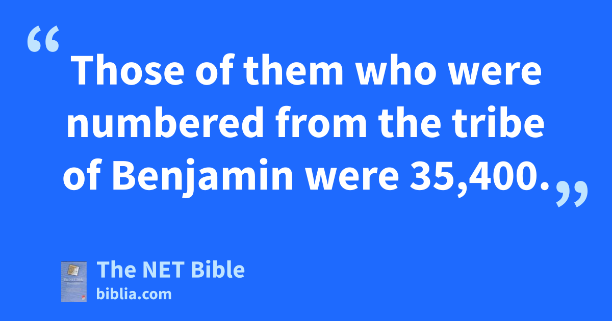 1:36 From the descendants of Benjamin: According to the records of their clans and families, all the males twenty years old or older who could serve in the army were listed by name. 1:37 Those of them who were numbered from the tribe of Benjamin were 35,400.