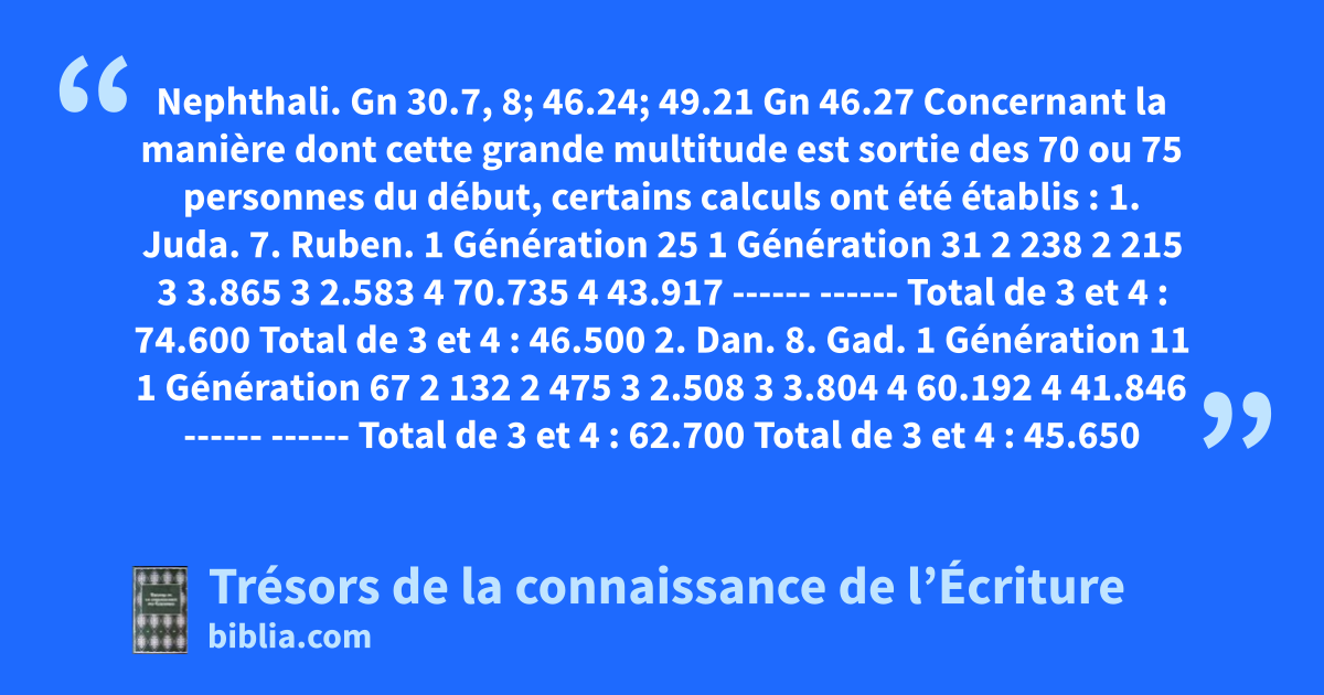 Nephthali. Gn 30.7, 8; 46.24; 49.21 Gn 46.27 Concernant la manière dont cette grande multitude est sortie des 70 ou 75 personnes du début, certains calculs ont été établis : 1. Juda. 7. Ruben. 1 Génération 25 1 Génération 31 2 238 2 215 3 3.865 3 2.583 4 70.735 4 43.917 ------ ------ Total de 3 et 4 : 74.600 Total de 3 et 4 : 46.500 2. Dan. 8. Gad. 1 Génération 11 1 Génération 67 2 132 2 475 3 2.508 3 3.804 4 60.192 4 41.846 ------ ------ Total de 3 et 4 : 62.700 Total de 3 et 4 : 45.650 3. Siméon. 9. Aser. 1 Génération 39 1 Génération 39 2 359 2 310 3 3.953 3 3.192 4 55.347 4 38.308 ------ ------ Total de 3 et 4 : 59.300 Total de 3 et 4 : 41.500 4. Zabulon. 10. Ephraïm. 1 Génération 20 1 Génération 16 2 143 2 160 3 2.296 3 1.928 4 55.104 4 38.572 ------ ------ Total de 3 et 4 : 57.400 Total de 3 et 4 : 40.500 5. Issacar. 11. Benjamin. 1 Génération 27 1 Génération 98 2 251 2 885 3 3.022 3 4.425 4 51.378 4 30.975 ------ ------ Total de 3 et 4 : 54.400 Total de 3 et 4 : 35.400 6. Nephthali. 12. Manassé. 1 Génération 26 1 Génération 10 2 296 2 134 3 3.560 3 1.610 4 49.840 4 30.590 ------ ------ Total de 3 et 4 : 53.400 Total de 3 et 4 : 32.200 13. Lévi. 1 Génération 8 2 96 3 1.240 4 21.060 ------ Total de 3 et 4 : 22.300 \-