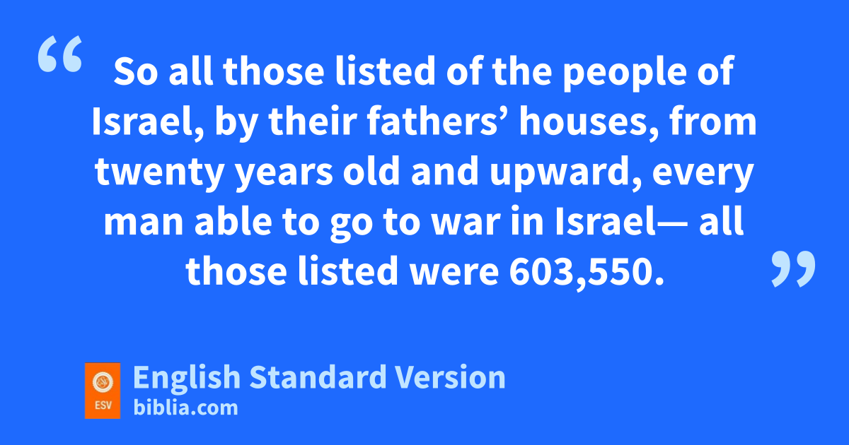 44 iThese are those who were listed, whom Moses and Aaron listed with the help of the chiefs of Israel, twelve men, each representing his fathers’ house. 45 So all those listed of the people of Israel, by their fathers’ houses, from twenty years old and upward, every man able to go to war in Israel— 46 all those listed were j603,550.