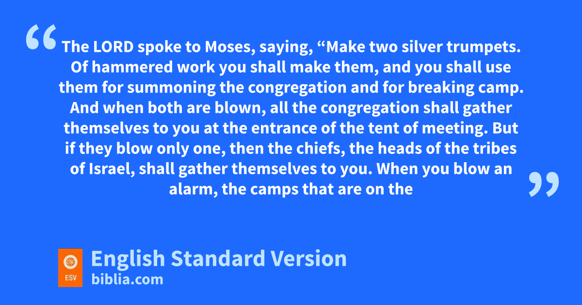 10 The Lord spoke to Moses, saying, 2 “Make two silver trumpets. Of hammered work you shall make them, and you shall use them for xsummoning the congregation and for breaking camp. 3 And when yboth are blown, all the congregation shall gather themselves to you at the entrance of the tent of meeting. 4 But if they blow only one, then zthe chiefs, the heads of the tribes of Israel, shall gather themselves to you. 5 When you blow an alarm, athe camps that are on the east side shall set out. 6 And when you blow an alarm the second time, bthe camps that are on the south side shall set out. An alarm is to be blown whenever they are to set out. 7 But when the assembly is to be gathered together, cyou shall blow a long blast, but you shall not dsound an alarm. 8 eAnd the sons of Aaron, the priests, shall blow the trumpets. The trumpets shall be to you for a perpetual statute throughout your generations. 9 And fwhen you go to war in your land against the adversary who goppresses you, then you shall dsound an alarm with the trumpets, that you may be hremembered before the Lord your God, and you shall be saved from your enemies. 10 iOn the day of your gladness also, and at your appointed feasts and jat the beginnings of your months, you shall blow the trumpets over your burnt offerings and over the sacrifices of your peace offerings. They shall be ka reminder of you before your God: I am the Lord your God.”