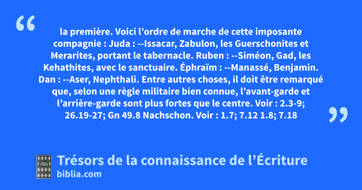 la première. Voici l’ordre de marche de cette imposante compagnie : Juda : --Issacar, Zabulon, les Guerschonites et Merarites, portant le tabernacle. Ruben : --Siméon, Gad, les Kehathites, avec le sanctuaire. Éphraïm : --Manassé, Benjamin. Dan : --Aser, Nephthali. Entre autres choses, il doit être remarqué que, selon une règle militaire bien connue, l’avant-garde et l’arrière-garde sont plus fortes que le centre. Voir : 2.3-9; 26.19-27; Gn 49.8 Nachschon. Voir : 1.7; 7.12
