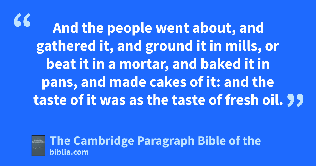 4 And the emixt multitude that was among them * fell a lusting: and the children of Israel also * wept again, and said, fWho shall give us flesh to eat? 5 gWe remember the fish, which we did eat in Egypt freely; the cucumbers, and the melons, and the leeks, and the onions, and the garlick: 6 but now our soul is dried away: there is nothing at all, beside this manna, before our eyes. 7 And hthe manna was as coriander seed, and the * colour thereof as the colour of ibdellium. 8 And the people kwent about, and gathered it, and ground it in mills, or beat it in a mortar, and baked it in pans, and made cakes of it: and the taste of it was as the taste of lfresh oil. 9 And mwhen the dew fell upon the camp in the night, the manna fell upon it. 10 Then Moses heard the people weep throughout their families, every man in the door of his tent: and the anger of the Lord was kindled greatly; Moses also nwas displeased. 11 oAnd Moses said unto the Lord, Wherefore hast thou afflicted thy servant? and wherefore have I not found favour in thy sight, that thou layest the burden of all this people upon me? 12 Have I conceived all this people? have I begotten them, that thou shouldest say unto me, pCarry them in thy bosom, as a qnursing father beareth the sucking child, unto the land which thou rswarest unto their fathers? 13 sWhence should I have flesh to give unto all this people? for they weep unto me, saying, Give us flesh, that we may eat. 14 tI am not able to bear all this people alone, because it is too heavy for me. 15 And if thou deal thus with me, ukill me, I pray thee, out of hand, if I have found favour in thy sight; and let me not xsee my wretchedness.