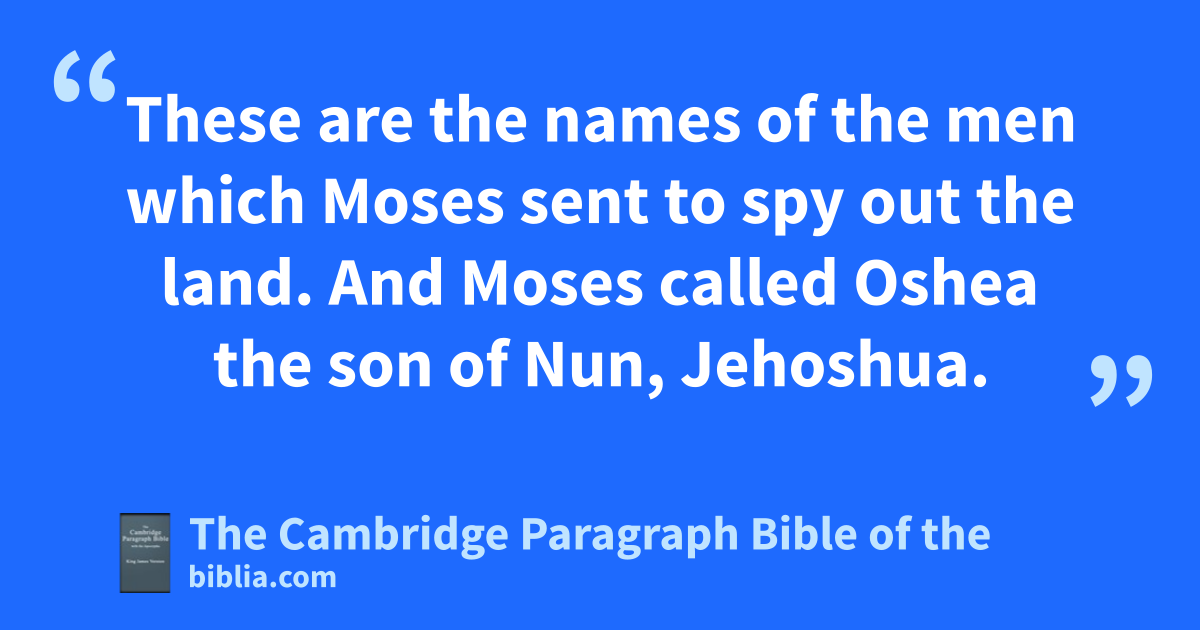XIII. And the Lord spake unto Moses, saying, 2 aSend thou men, that they may search the land of Canaan, which I give unto the children of Israel: of every tribe of their fathers shall ye send a man, every one a ruler among them. 3 And Moses by the commandment of the Lord sent them bfrom the wilderness of Paran: all those men were heads of the children of Israel. 4 And these were their names: of the tribe of Reuben, Shammua the son of Zaccur. 5 Of the tribe of Simeon, Shaphat the son of Hori. 6 cOf the tribe of Judah, dCaleb the son of Jephunneh. 7 Of the tribe of Issachar, Igal the son of Joseph. 8 Of the tribe of Ephraim, eOshea the son of Nun. 9 Of the tribe of Benjamin, Palti the son of Raphu. 10 Of the tribe of Zebulun, Gaddiel the son of Sodi. 11 Of the tribe of Joseph, namely, of the tribe of Manasseh, Gaddi the son of Susi. 12 Of the tribe of Dan, Ammiel the son of Gemalli. 13 Of the tribe of Asher, Sethur the son of Michael. 14 Of the tribe of Naphtali, Nahbi the son of Vophsi. 15 Of the tribe of Gad, Geuel the son of Machi. 16 These are the names of the men which Moses sent to spy out the land. And Moses called fOshea the son of Nun, Jehoshua. 17 And Moses sent them to spy out the land of Canaan, and said unto them, Get you up this way gsouthward, and go up into hthe mountain: 18 and see the land, what it is; and the people that dwelleth therein, whether they be strong or weak, few or many; 19 and what the land is that they dwell in, whether it be good or bad; and what cities they be that they dwell in, whether in tents, or in strong holds; 20 and what the land is, whether it be ifat or lean, whether there be wood therein, or not. And kbe ye of good courage, and bring of the fruit of the land. Now the time was the time of the first ripe grapes. 21 So they went up, and searched the land lfrom the wilderness of Zin unto mRehob, nas men come to Hamath. 22 And they ascended by the south, and came unto Hebron; where oAhiman, Sheshai, and Talmai, the children of Anak, were. (Now pHebron was built seven years before qZoan in Egypt.) 23 rAnd they came unto the * brook of Eshcol, and cut down from thence a branch with one cluster of grapes, and they bare it between two upon a sstaff; and they brought of the pomegranates, and of the figs. 24 The place was called the * brook * Eshcol, because of the cluster of grapes which the children of Israel cut down from thence. 25 And they returned from searching of the land after forty days.