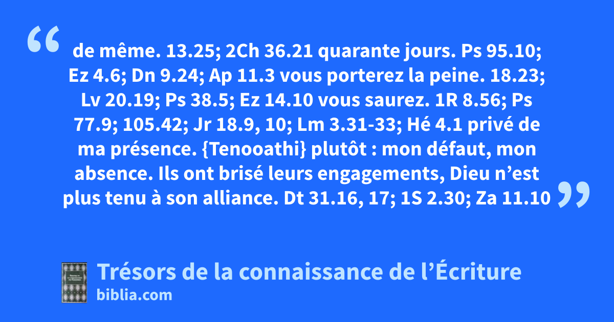 de même. 13.25; 2Ch 36.21 quarante jours. Ps 95.10; Ez 4.6; Dn 9.24; Ap 11.3 vous porterez la peine. 18.23; Lv 20.19; Ps 38.5; Ez 14.10 vous saurez. 1R 8.56; Ps 77.9; 105.42; Jr 18.9, 10; Lm 3.31-33; Hé 4.1 privé de ma présence. {Tenooathi} plutôt : mon défaut, mon absence. Ils ont brisé leurs engagements, Dieu n’est plus tenu à son alliance. Dt 31.16, 17; 1S 2.30; Za 11.10