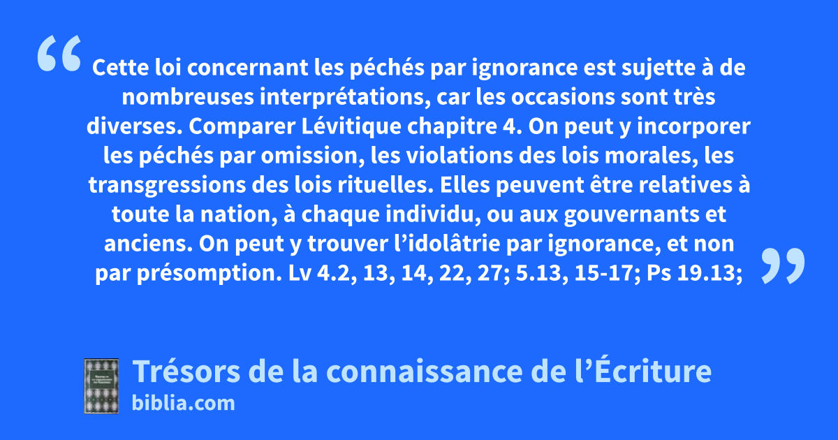 Cette loi concernant les péchés par ignorance est sujette à de nombreuses interprétations, car les occasions sont très diverses. Comparer Lévitique chapitre 4. On peut y incorporer les péchés par omission, les violations des lois morales, les transgressions des lois rituelles. Elles peuvent être relatives à toute la nation, à chaque individu, ou aux gouvernants et anciens. On peut y trouver l’idolâtrie par ignorance, et non par présomption. Lv 4.2, 13, 14, 22, 27; 5.13, 15-17; Ps 19.13; Lc 12.48