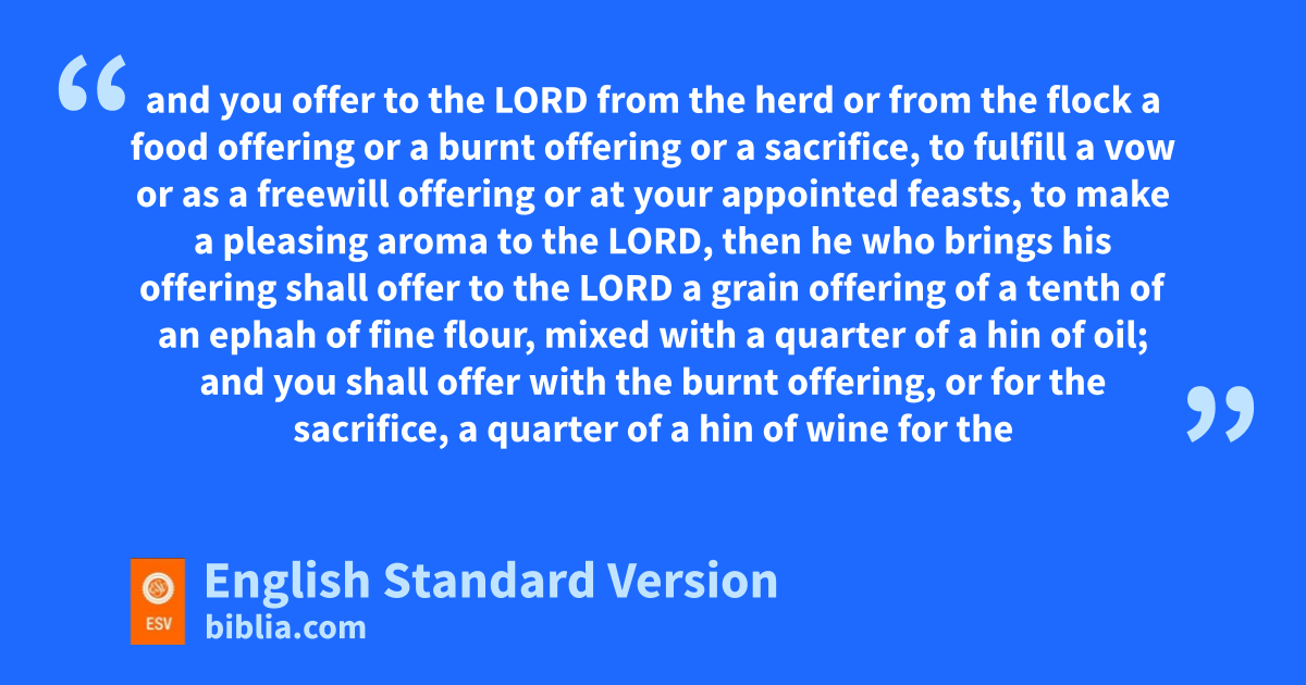15 The Lord spoke to Moses, saying, 2 “Speak to the people of Israel and say to them, xWhen you come into the land you are to inhabit, which I am giving you, 3 and yyou offer to the Lord from the herd or from the flock a food offering1 or a burnt offering or a sacrifice, zto fulfill a vow or as a freewill offering or aat your appointed feasts, to make a bpleasing aroma to the Lord, 4 then che who brings his offering shall offer to the Lord da grain offering of a tenth of an ephah2 of fine flour, emixed with a quarter of a hin3 of oil; 5 and you shall offer with the burnt offering, or for the sacrifice, a quarter of a hin of fwine for the drink offering for each lamb. 6 gOr for a ram, you shall offer for a grain offering two tenths of an ephah of fine flour mixed with a third of a hin of oil. 7 And for the drink offering you shall offer a third of a hin of wine, a bpleasing aroma to the Lord. 8 And when you offer a bull as a burnt offering or sacrifice, to zfulfill a vow or for hpeace offerings to the Lord, 9 then one shall offer iwith the bull a grain offering of three tenths of an ephah of fine flour, mixed with half a hin of oil. 10 And you shall offer for the drink offering half a hin of wine, as a food offering, a pleasing aroma to the Lord.