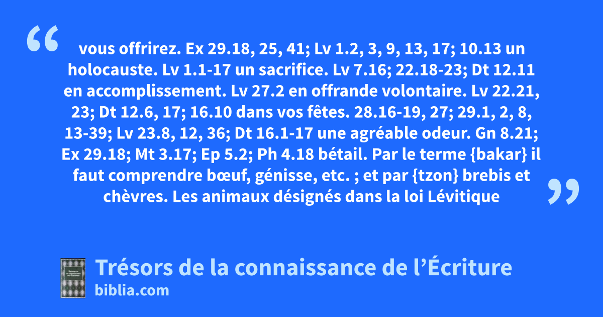 vous offrirez. Ex 29.18, 25, 41; Lv 1.2, 3, 9, 13, 17; 10.13 un holocauste. Lv 1.1-17 un sacrifice. Lv 7.16; 22.18-23; Dt 12.11 en accomplissement. Lv 27.2 en offrande volontaire. Lv 22.21, 23; Dt 12.6, 17; 16.10 dans vos fêtes. 28.16-19, 27; 29.1, 2, 8, 13-39; Lv 23.8, 12, 36; Dt 16.1-17 une agréable odeur. Gn 8.21; Ex 29.18; Mt 3.17; Ep 5.2; Ph 4.18 bétail. Par le terme {bakar} il faut comprendre bœuf, génisse, etc. ; et par {tzon} brebis et chèvres. Les animaux désignés dans la loi Lévitique sont les mêmes que ceux qu’il a été ordonné à Abraham d’offrir. Gn 15.9 Dieu avait donné aux patriarches un résumé de cette loi, qui fut ensuite donnée en détail à Moïse, et dont l’essentiel consistait dans les sacrifices d’animaux purs, parfaits. Les animaux féroces et les oiseaux de proie en étaient exclus.
