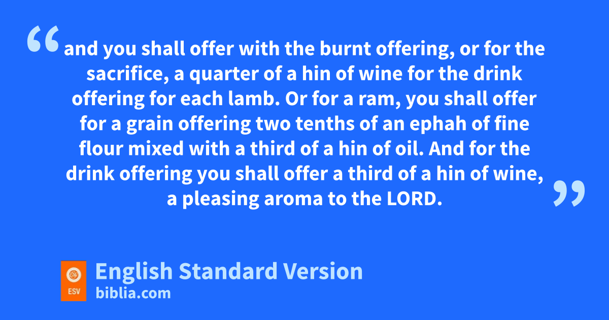 15 The Lord spoke to Moses, saying, 2 “Speak to the people of Israel and say to them, xWhen you come into the land you are to inhabit, which I am giving you, 3 and yyou offer to the Lord from the herd or from the flock a food offering1 or a burnt offering or a sacrifice, zto fulfill a vow or as a freewill offering or aat your appointed feasts, to make a bpleasing aroma to the Lord, 4 then che who brings his offering shall offer to the Lord da grain offering of a tenth of an ephah2 of fine flour, emixed with a quarter of a hin3 of oil; 5 and you shall offer with the burnt offering, or for the sacrifice, a quarter of a hin of fwine for the drink offering for each lamb. 6 gOr for a ram, you shall offer for a grain offering two tenths of an ephah of fine flour mixed with a third of a hin of oil. 7 And for the drink offering you shall offer a third of a hin of wine, a bpleasing aroma to the Lord. 8 And when you offer a bull as a burnt offering or sacrifice, to zfulfill a vow or for hpeace offerings to the Lord, 9 then one shall offer iwith the bull a grain offering of three tenths of an ephah of fine flour, mixed with half a hin of oil. 10 And you shall offer for the drink offering half a hin of wine, as a food offering, a pleasing aroma to the Lord.