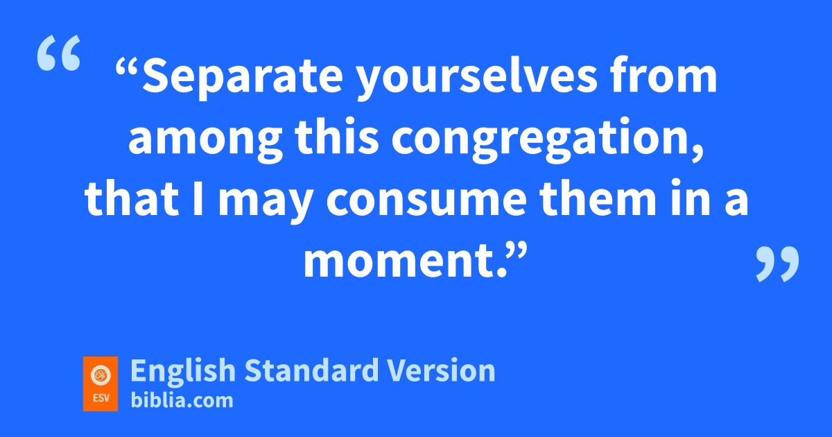 20 And the Lord spoke to Moses and to Aaron, saying, 21 g“Separate yourselves from among this congregation, that I may consume them hin a moment.” 22 And they ifell on their faces and said, “O God, jthe God of the spirits of all flesh, kshall one man sin, and will you be angry with all the congregation?” 23 And the Lord spoke to Moses, saying, 24 “Say to the congregation, Get away from the dwelling of Korah, Dathan, and Abiram.”