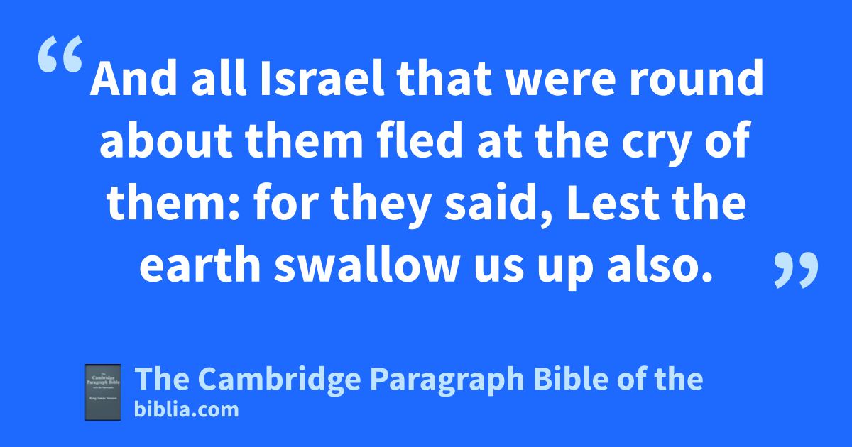 XVI. * Now aKorah, the son of Izhar, the son of Kohath, the son of Levi, and bDathan and Abiram, the sons of Eliab, and On, the son of Peleth, sons of Reuben, took men: 2 and they rose up before Moses, with certain of the children of Israel, two hundred and fifty princes of the assembly, bfamous in the congregation, men of renown: 3 and cthey gathered themselves together against Moses and against Aaron, and said unto them, * Ye take too much upon you, seeing dall the congregation are holy, every one of them, eand the Lord is among them: wherefore then lift you up yourselves above the congregation of the Lord? 4 And when Moses heard it, fhe fell upon his face: 5 and he spake unto Korah and unto all his company, saying, Even to morrow the Lord will shew who are his, and who is gholy; and will cause him to come near unto him: even him whom he hath hchosen will he cause to icome near unto him. 6 This do; Take you jcensers, Korah, and all his company; 7 and put fire therein, and put incense in them before the Lord to morrow: and it shall be that the man whom the Lord doth choose, he shall be holy: ye take too much upon you, ye sons of Levi. 8 And Moses said unto Korah, Hear, I pray you, ye sons of Levi: 9 seemeth it but ka small thing unto you, that the God of Israel hath lseparated you from the congregation of Israel, to bring you near to himself to do the service of the tabernacle of the Lord, and to stand before the congregation to minister unto them? 10 And he hath brought thee near to him, and all thy brethren the sons of Levi with thee: and seek ye the priesthood also? 11 For which cause both thou and all thy company are gathered together against the Lord: mand what is Aaron, that ye murmur against him? 12 And Moses sent to call Dathan and Abiram, the sons of Eliab: which said, We will not come up: 13 nis it a small thing that thou hast brought us up out of a land othat floweth with milk and honey, to kill us in the wilderness, except thou pmake thyself altogether a prince over us? 14 Moreover thou hast not brought us into a land othat floweth with milk and honey, or given us inheritance of fields and vineyards: wilt thou * put out the eyes of these men? we will not come up. 15 And Moses was very wroth, and said unto the Lord, qRespect not thou their offering: rI have not taken one ass from them, neither have I hurt one of them. 16 And Moses said unto Korah, Be thou and all thy company sbefore the Lord, thou, and they, and Aaron, to morrow: 17 and ttake every man his censer, and put incense in them, and bring ye before the Lord every man his censer, two hundred and fifty censers; thou also, and Aaron, each of you his censer. 18 And they took every man his censer, and put fire in them, and laid incense thereon, and stood in the door of the tabernacle of the congregation with Moses and Aaron. 19 And Korah gathered all the congregation against them unto the door of the tabernacle of the congregation: and uthe glory of the Lord appeared unto all the congregation. 20 And the Lord spake unto Moses and unto Aaron, saying, 21 xSeparate yourselves from among this congregation, that I may consume them yin a moment. 22 And they zfell upon their faces, and said, O God, athe God of the spirits of all flesh, shall one man sin, and wilt thou be wroth with all the congregation? 23 And the Lord spake unto Moses, saying, 24 Speak unto the congregation, saying, Get you up from about the tabernacle of Korah, Dathan, and Abiram. 25 And Moses rose up and went unto Dathan and Abiram; and the elders of Israel followed him. 26 And he spake unto the congregation, saying, bDepart, I pray you, from the tents of these wicked men, and touch nothing of theirs, lest ye cbe consumed in all their sins. 27 So they gat up from the tabernacle of Korah, Dathan, and Abiram, on every side: and Dathan and Abiram came out, and dstood in the door of their tents, and their wives, and their sons, and their little children. 28 And Moses said, cHereby ye shall know that the Lord hath sent me to do all these works; for I have not done them eof mine own mind. 29 If these men die * the common death of all men, or if they be fvisited after the visitation of all men; then the Lord hath not sent me. 30 But if the Lord * make a new thing, and gthe earth open her mouth, and swallow them up, with all that appertain unto them, and they hgo down quick into the pit; then ye shall understand that these men ihave provoked the Lord. 31 jAnd it came to pass, as he had made an end of speaking all these words, that the ground clave asunder that was under them: 32 and the earth opened her mouth, and swallowed them up, and their houses, and kall the men that appertained unto Korah, and all their goods. 33 They, and all that appertained to them, went down alive into the pit, and the earth closed upon them: and they perished from among the congregation. 34 And all Israel that were round about them fled at the cry of them: for they said, Lest the earth swallow us up also. 35 And there lcame out a fire from the Lord, and consumed the two hundred and fifty men that offered incense.