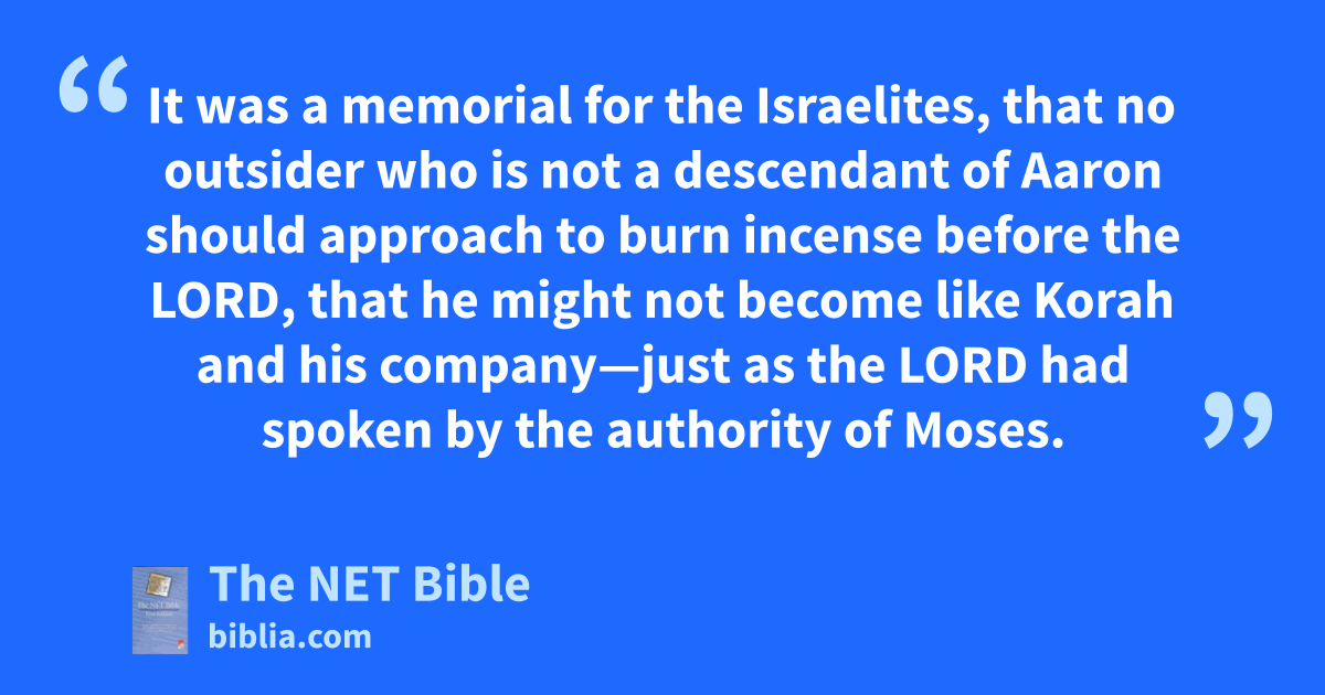 16:36 (17:1)49 The Lord spoke to Moses: 16:37 “Tell50 Eleazar son of Aaron the priest to pick up51 the censers out of the flame, for they are holy, and then scatter the coals of fire52 at a distance. 16:38 As for the censers of these men who sinned at the cost of their lives,53 they must be made54 into hammered sheets for covering the altar, because they presented them before the Lord and sanctified them. They will become a sign to the Israelites.” 16:39 So Eleazar the priest took the bronze censers presented by those who had been burned up, and they were hammered out as a covering for the altar. 16:40 It was a memorial for the Israelites, that no outsider who is not a descendant of55 Aaron should approach to burn incense before the Lord, that he might not become like Korah and his company—just as the Lord had spoken by the authority56 of Moses. 16:41 But on the next day the whole community of Israelites murmured against Moses and Aaron, saying, “You have killed the Lord’s people!”57 16:42 When the community assembled58 against Moses and Aaron, they turned toward the tent of meeting—and59 the cloud covered it, and the glory of the Lord appeared. 16:43 Then Moses and Aaron stood before the tent of meeting.