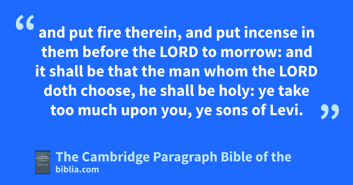 XVI. * Now aKorah, the son of Izhar, the son of Kohath, the son of Levi, and bDathan and Abiram, the sons of Eliab, and On, the son of Peleth, sons of Reuben, took men: 2 and they rose up before Moses, with certain of the children of Israel, two hundred and fifty princes of the assembly, bfamous in the congregation, men of renown: 3 and cthey gathered themselves together against Moses and against Aaron, and said unto them, * Ye take too much upon you, seeing dall the congregation are holy, every one of them, eand the Lord is among them: wherefore then lift you up yourselves above the congregation of the Lord? 4 And when Moses heard it, fhe fell upon his face: 5 and he spake unto Korah and unto all his company, saying, Even to morrow the Lord will shew who are his, and who is gholy; and will cause him to come near unto him: even him whom he hath hchosen will he cause to icome near unto him. 6 This do; Take you jcensers, Korah, and all his company; 7 and put fire therein, and put incense in them before the Lord to morrow: and it shall be that the man whom the Lord doth choose, he shall be holy: ye take too much upon you, ye sons of Levi. 8 And Moses said unto Korah, Hear, I pray you, ye sons of Levi: 9 seemeth it but ka small thing unto you, that the God of Israel hath lseparated you from the congregation of Israel, to bring you near to himself to do the service of the tabernacle of the Lord, and to stand before the congregation to minister unto them? 10 And he hath brought thee near to him, and all thy brethren the sons of Levi with thee: and seek ye the priesthood also? 11 For which cause both thou and all thy company are gathered together against the Lord: mand what is Aaron, that ye murmur against him? 12 And Moses sent to call Dathan and Abiram, the sons of Eliab: which said, We will not come up: 13 nis it a small thing that thou hast brought us up out of a land othat floweth with milk and honey, to kill us in the wilderness, except thou pmake thyself altogether a prince over us? 14 Moreover thou hast not brought us into a land othat floweth with milk and honey, or given us inheritance of fields and vineyards: wilt thou * put out the eyes of these men? we will not come up. 15 And Moses was very wroth, and said unto the Lord, qRespect not thou their offering: rI have not taken one ass from them, neither have I hurt one of them. 16 And Moses said unto Korah, Be thou and all thy company sbefore the Lord, thou, and they, and Aaron, to morrow: 17 and ttake every man his censer, and put incense in them, and bring ye before the Lord every man his censer, two hundred and fifty censers; thou also, and Aaron, each of you his censer. 18 And they took every man his censer, and put fire in them, and laid incense thereon, and stood in the door of the tabernacle of the congregation with Moses and Aaron. 19 And Korah gathered all the congregation against them unto the door of the tabernacle of the congregation: and uthe glory of the Lord appeared unto all the congregation. 20 And the Lord spake unto Moses and unto Aaron, saying, 21 xSeparate yourselves from among this congregation, that I may consume them yin a moment. 22 And they zfell upon their faces, and said, O God, athe God of the spirits of all flesh, shall one man sin, and wilt thou be wroth with all the congregation? 23 And the Lord spake unto Moses, saying, 24 Speak unto the congregation, saying, Get you up from about the tabernacle of Korah, Dathan, and Abiram. 25 And Moses rose up and went unto Dathan and Abiram; and the elders of Israel followed him. 26 And he spake unto the congregation, saying, bDepart, I pray you, from the tents of these wicked men, and touch nothing of theirs, lest ye cbe consumed in all their sins. 27 So they gat up from the tabernacle of Korah, Dathan, and Abiram, on every side: and Dathan and Abiram came out, and dstood in the door of their tents, and their wives, and their sons, and their little children. 28 And Moses said, cHereby ye shall know that the Lord hath sent me to do all these works; for I have not done them eof mine own mind. 29 If these men die * the common death of all men, or if they be fvisited after the visitation of all men; then the Lord hath not sent me. 30 But if the Lord * make a new thing, and gthe earth open her mouth, and swallow them up, with all that appertain unto them, and they hgo down quick into the pit; then ye shall understand that these men ihave provoked the Lord. 31 jAnd it came to pass, as he had made an end of speaking all these words, that the ground clave asunder that was under them: 32 and the earth opened her mouth, and swallowed them up, and their houses, and kall the men that appertained unto Korah, and all their goods. 33 They, and all that appertained to them, went down alive into the pit, and the earth closed upon them: and they perished from among the congregation. 34 And all Israel that were round about them fled at the cry of them: for they said, Lest the earth swallow us up also. 35 And there lcame out a fire from the Lord, and consumed the two hundred and fifty men that offered incense.