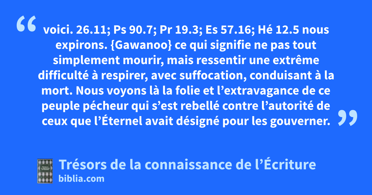 voici. 26.11; Ps 90.7; Pr 19.3; Es 57.16; Hé 12.5 nous expirons. {Gawanoo} ce qui signifie ne pas tout simplement mourir, mais ressentir une extrême difficulté à respirer, avec suffocation, conduisant à la mort. Nous voyons là la folie et l’extravagance de ce peuple pécheur qui s’est rebellé contre l’autorité de ceux que l’Éternel avait désigné pour les gouverner.