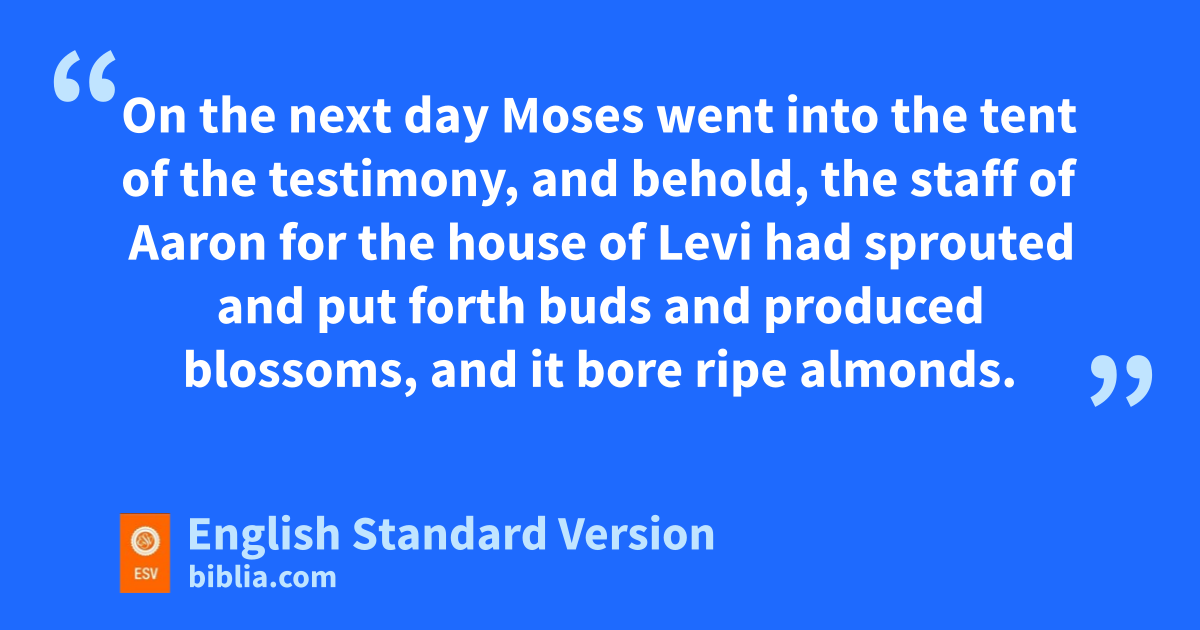 8 On the next day Moses went into the tent of the testimony, and behold, the staff of Aaron for the house of Levi had sprouted and put forth buds and produced blossoms, and it bore ripe almonds. 9 Then Moses brought out all the staffs from before the Lord to all the people of Israel. And they looked, and each man took his staff. 10 And the Lord said to Moses, “Put back mthe staff of Aaron before the testimony, to be kept nas a sign for the rebels, othat you may make an end of their grumblings against me, lest they die.” 11 Thus did Moses; as the Lord commanded him, so he did.