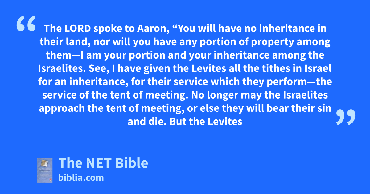 18:20 The Lord spoke to Aaron, “You will have no inheritance in their land, nor will you have any portion of property18 among them—I am your portion and your inheritance among the Israelites. 18:21 See, I have given the Levites all the tithes in Israel for an inheritance, for their service which they perform—the service of the tent of meeting. 18:22 No longer may the Israelites approach the tent of meeting, or else they will bear their sin19 and die. 18:23 But the Levites must perform the service20 of the tent of meeting, and they must bear their iniquity.21 It will be a perpetual ordinance throughout your generations that among the Israelites the Levites22 have no inheritance.23 18:24 But I have given24 to the Levites for an inheritance the tithes of the Israelites that are offered25 to the Lord as a raised offering. That is why I said to them that among the Israelites they are to have no inheritance.”