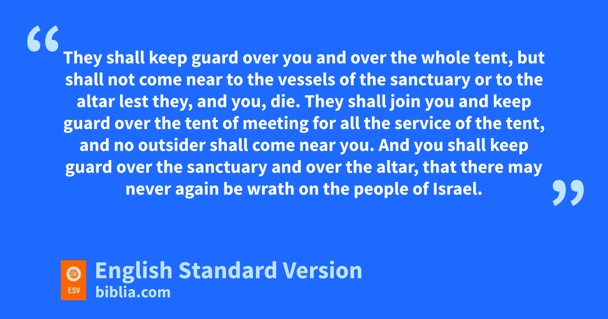 18 So the Lord said to Aaron, “You and your sons and your father’s house with you shall qbear iniquity connected with the sanctuary, rand you and your sons with you shall bear iniquity connected with your priesthood. 2 And with you bring your brothers also, the tribe of Levi, the tribe of your father, that they may sjoin you and tminister to you while you and your sons with you are before the tent of the testimony. 3 They shall keep guard over you and uover the whole tent, vbut shall not come near to the vessels of the sanctuary or to the altar wlest they, and you, die. 4 They shall join you and keep guard over the tent of meeting for all the service of the tent, xand no outsider shall come near you. 5 And you shall ykeep guard over the sanctuary and over the altar, zthat there may never again be wrath on the people of Israel. 6 aAnd behold, I have taken your brothers the Levites from among the people of Israel. bThey are a gift to you, given to the Lord, to do the service of the tent of meeting. 7 And cyou and your sons with you shall guard your priesthood for all that concerns the altar and dthat is within the veil; and you shall serve. I give your priesthood as a gift,1 and eany outsider who comes near shall be put to death.”