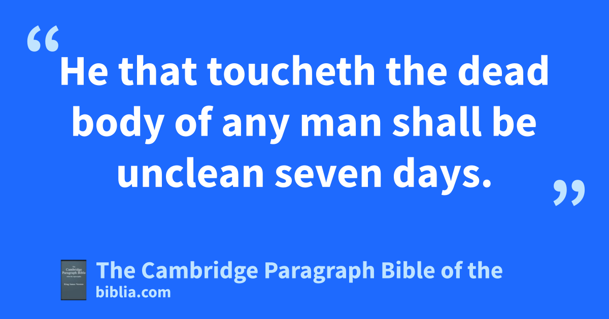 11 kHe that toucheth the dead body of any * man shall be unclean seven days. 12 He lshall purify himself with it on the third day, and on the seventh day he shall be clean: but if he purify not himself the third day, then the seventh day he shall not be clean. 13 Whosoever toucheth the dead body of any man that is dead, and purifieth not himself, mdefileth the tabernacle of the Lord; and nthat soul shall be cut off from Israel: because the water of separation was not sprinkled upon him, he shall be unclean; nhis uncleanness is yet upon him. 14 This is the law, when a man dieth in a tent: all that come into the tent, and all that is in the tent, shall be unclean seven days. 15 And every oopen vessel, which hath no covering bound upon it, is unclean. 16 And pwhosoever toucheth one that is slain with a sword in the open fields, or a dead body, or a bone of a man, or a grave, shall be unclean seven days. 17 And for an unclean person they shall take of the * ashes qof the burnt heifer of purification for sin, and * running water shall be put thereto in a vessel: 18 and a clean person shall take rhyssop, and dip it in the water, and sprinkle it upon the tent, and upon all the vessels, and upon the persons that were there, and upon him that touched a bone, or one slain, or one dead, or a grave: 19 and the clean person shall sprinkle upon the unclean son the third day, and on the seventh day: and ton the seventh day he shall purify himself, and uwash his clothes, and bathe himself in water, and shall be clean at even. 20 But the man that shall be unclean, and shall not purify himself, xthat soul shall be cut off from among the congregation, because he hath defiled the sanctuary of the Lord: the water of separation hath not been sprinkled upon him; he is unclean. 21 And it shall be a perpetual statute unto them, that he that sprinkleth the water of separation shall wash his clothes; and he that toucheth the water of separation shall be unclean until even. 22 And ywhatsoever the unclean person toucheth shall be unclean; and the soul that toucheth it shall be unclean until even.