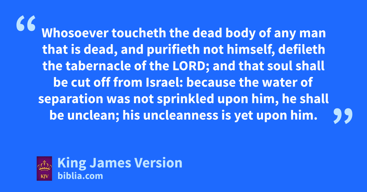 11 kHe that toucheth the dead body of any †man shall be unclean seven days. 12 He lshall purify himself with it on the third day, and on the seventh day he shall be clean: but if he purify not himself the third day, then the seventh day he shall not be clean. 13 Whosoever toucheth the dead body of any man that is dead, and purifieth not himself, mdefileth the tabernacle of the Lord; and nthat soul shall be cut off from Israel: because the water of separation was not sprinkled upon him, he shall be unclean; nhis uncleanness is yet upon him. 14 This is the law, when a man dieth in a tent: all that come into the tent, and all that is in the tent, shall be unclean seven days. 15 And every oopen vessel, which hath no covering bound upon it, is unclean. 16 And pwhosoever toucheth one that is slain with a sword in the open fields, or a dead body, or a bone of a man, or a grave, shall be unclean seven days. 17 And for an unclean person they shall take of the †ashes qof the burnt heifer of purification for sin, and †running water shall be put thereto in a vessel: 18 And a clean person shall take rhyssop, and dip it in the water, and sprinkle it upon the tent, and upon all the vessels, and upon the persons that were there, and upon him that touched a bone, or one slain, or one dead, or a grave: 19 And the clean person shall sprinkle upon the unclean son the third day, and on the seventh day: and ton the seventh day he shall purify himself, and uwash his clothes, and bathe himself in water, and shall be clean at even. 20 But the man that shall be unclean, and shall not purify himself, xthat soul shall be cut off from among the congregation, because he hath defiled the sanctuary of the Lord: the water of separation hath not been sprinkled upon him; he is unclean. 21 And it shall be a perpetual statute unto them, that he that sprinkleth the water of separation shall wash his clothes; and he that toucheth the water of separation shall be unclean until even. 22 And ywhatsoever the unclean person toucheth shall be unclean; and the soul that toucheth it shall be unclean until even.