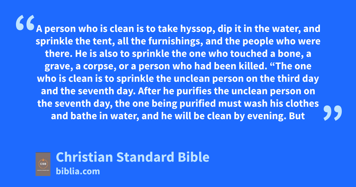 14 “This is the law when a person dies in a tent: everyone who enters the tent and everyone who is already in the tent will be unclean for seven days, 15 and any open container without a lid tied on it is unclean. 16 Anyone in the open field who touches a person who has been killed by the sword or has died, or who even touches a human bone, or a grave, will be unclean for seven days. 17 For the purification of the unclean person, they are to take some of the ashes of the burnt sin offering, put them in a jar, and add fresh water to them. 18 A person who is clean is to take hyssop, dip it in the water, and sprinkle the tent, all the furnishings, and the people who were there. He is also to sprinkle the one who touched a bone, a grave, a corpse, or a person who had been killed.