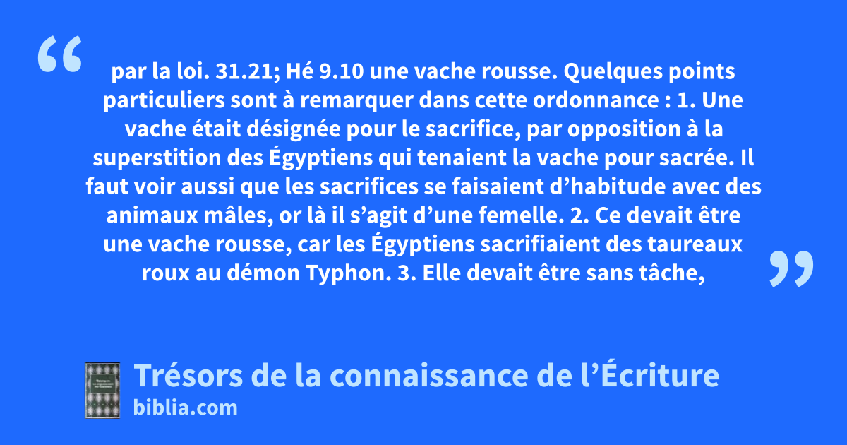 par la loi. 31.21; Hé 9.10 une vache rousse. Quelques points particuliers sont à remarquer dans cette ordonnance : 1. Une vache était désignée pour le sacrifice, par opposition à la superstition des Égyptiens qui tenaient la vache pour sacrée. Il faut voir aussi que les sacrifices se faisaient d’habitude avec des animaux mâles, or là il s’agit d’une femelle. 2. Ce devait être une vache rousse, car les Égyptiens sacrifiaient des taureaux roux au démon Typhon. 3. Elle devait être sans tâche, sans aucun mélange de couleur, comme les Égyptiens le faisaient pour leur taureau. 4. Sans défaut. Voir Lv 22.21 5. Qui n’ait point porté le joug : un animal qui aurait servi à des tâches communes ne serait pas valable pour un sacrifice. 6; Lv 14.6; Es 1.18; Ap 1.5 Sans défaut. Ex 12.5; Lv 22.20-25; Ml 1.13, 14; Lc 1.35; Hé 7.26; 1P 1.19 1P 2.22 qui n’ait point porté. Dt 21.3; 1S 6.7; Lm 1.14; Jn 10.17, 18; Ph 2.6-8