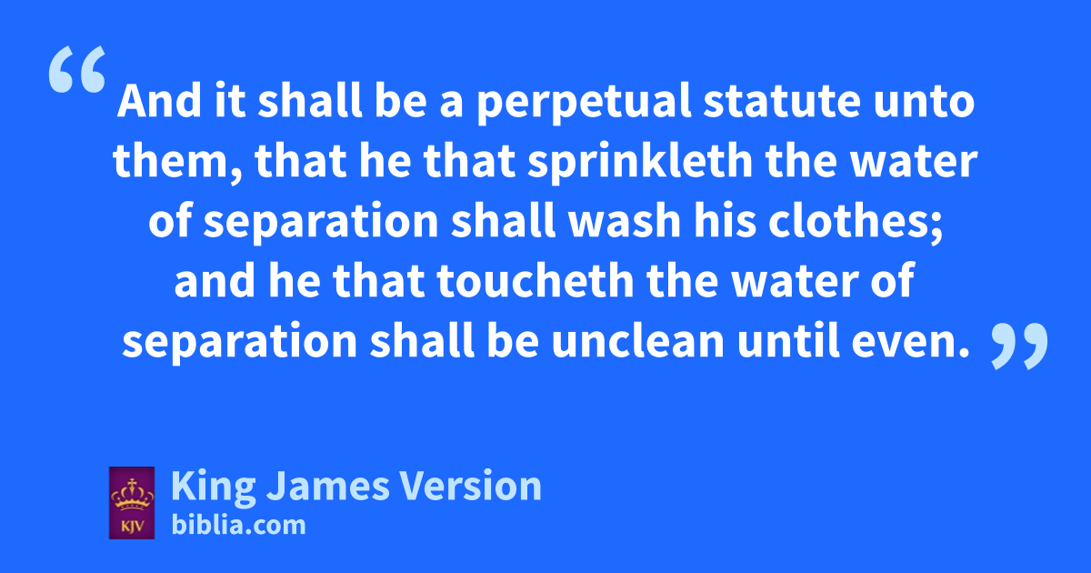 19 And the Lord spake unto Moses and unto Aaron, saying, 2 This is the ordinance of the law which the Lord hath commanded, saying, Speak unto the children of Israel, that they bring thee a red heifer without spot, wherein is no blemish, aand upon which never came yoke: 3 And ye shall give her unto Eleazar the priest, that he may bring her bforth without the camp, and one shall slay her before his face: 4 And Eleazar the priest shall take of her blood with his finger, and csprinkle of her blood directly before the tabernacle of the congregation seven times: 5 And one shall burn the heifer in his sight; dher skin, and her flesh, and her blood, with her dung, shall he burn: 6 And the priest shall take ecedar wood, and hyssop, and scarlet, and cast it into the midst of the burning of the heifer. 7 Then the priest fshall wash his clothes, and he shall bathe his flesh in water, and afterward he shall come into the camp, and the priest shall be unclean until the even. 8 And ghe that burneth her shall wash his clothes in water, and bathe his flesh in water, and shall be unclean until the even. 9 And a man that is clean shall gather up hthe ashes of the heifer, and lay them up without the camp in ia clean place, and it shall be kept for the congregation of the children of Israel jfor a water of separation: it is a purification for sin. 10 And he that gathereth the ashes of the heifer shall wash his clothes, and be unclean until the even: and it shall be unto the children of Israel, and unto the stranger that sojourneth among them, for a statute for ever.