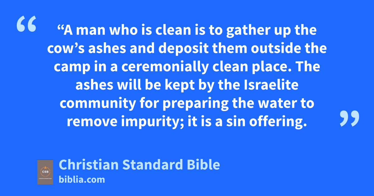 9 “A man who is clean is to gather up the cow’s ashes and deposit them outside the camp in a ceremonially clean place. The ashes will be kept by the Israelite community for preparing the water to remove impurity; it is a sin offering.b 10 Then the one who gathers up the cow’s ashes must wash his clothes, and he will remain unclean until evening. This is a permanent statute for the Israelites and for the alien who resides among them.