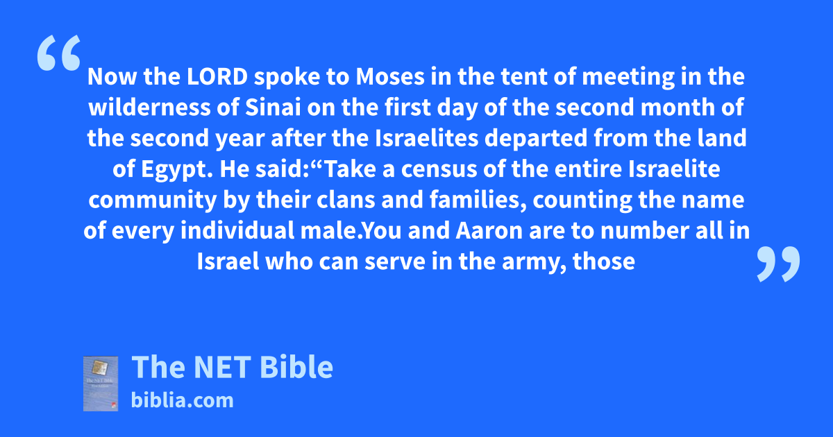 1:1 1 Now the Lord2 spoke3 to Moses in the tent of meeting4 in the wilderness5 of Sinai6 on the first day of the second month of the second year after7 the Israelites8 departed from the land of Egypt.9 He said:10 1:2 “Take a census11 of the entire12 Israelite community13 by their clans and families,14 counting the name of every individual male.15 1:3 You and Aaron are to number16 all in Israel who can serve in the army,17 those who are18 twenty years old or older,19 by their divisions.20 1:4 And to help you21 there is to be a man from each22 tribe, each man23 the head24 of his family.25 1:5 Now these are the names of the men who are to help26 you: