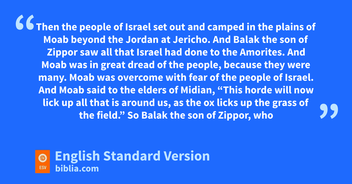 22 Then ithe people of Israel set out and camped in the plains of Moab beyond the Jordan at Jericho. 2 And jBalak the son of Zippor saw all that Israel had done to the Amorites. 3 And kMoab was in great dread of the people, because they were many. Moab was overcome with fear of the people of Israel. 4 And Moab said to lthe elders of Midian, “This horde will now lick up all that is around us, as the ox licks up the grass of the field.” So Balak the son of Zippor, who was king of Moab at that time, 5 msent messengers to Balaam the son of Beor nat Pethor, which is near the River1 in the land of the people of Amaw,2 to call him, saying, “Behold, a people has come out of Egypt. They cover the face of the earth, and they are dwelling opposite me. 6 oCome now, curse this people for me, since they are too mighty for me. Perhaps I shall be able to defeat them and drive them from the land, for I know that he whom you bless is blessed, and he whom you curse is cursed.”