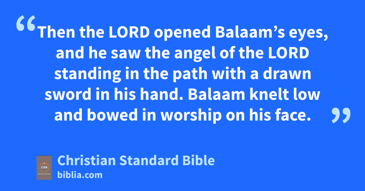 31 Then the Lord opened Balaam’s eyes, and he saw the angel of the Lord standing in the path with a drawn sword in his hand. Balaam knelt low and bowed in worship on his face. 32 The angel of the Lord asked him, “Why have you beaten your donkey these three times? Look, I came out to oppose you, because I consider what you are doing to be evil.A 33 The donkey saw me and turned away from me these three times. If she had not turned away from me, I would have killed you by now and let her live.”