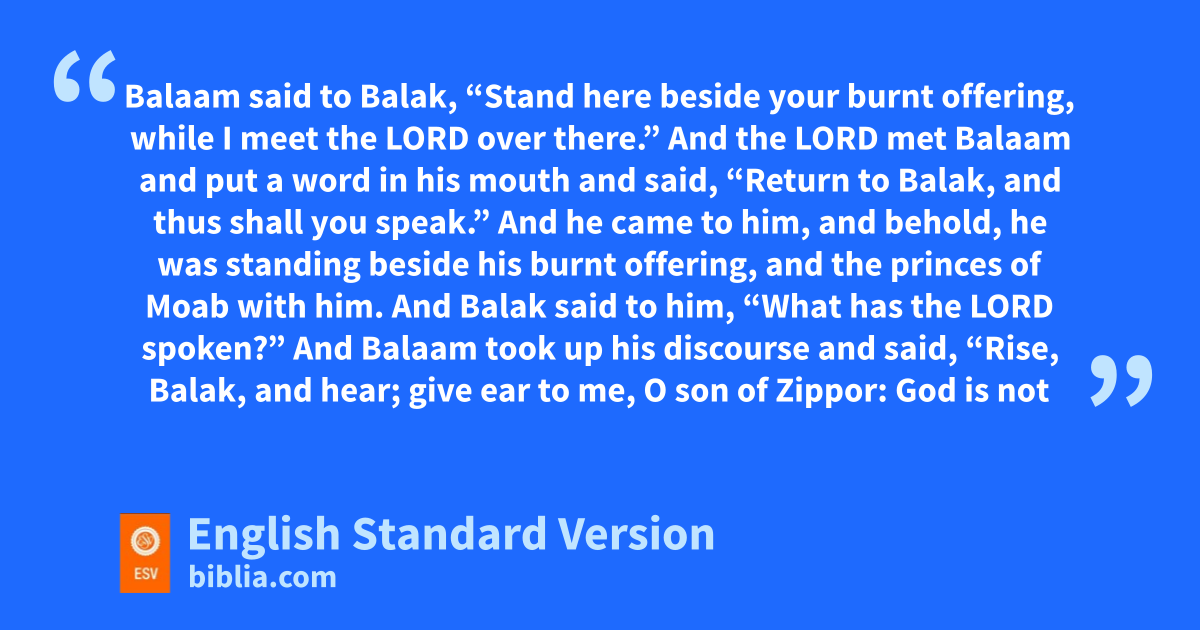23 And Balaam said to Balak, i“Build for me here seven altars, and prepare for me here seven bulls and seven rams.” 2 Balak did as Balaam had said. And Balak and Balaam joffered on each altar a bull and a ram. 3 And Balaam said to Balak, k“Stand beside your burnt offering, and I will go. Perhaps the Lord will come lto meet me, and whatever he shows me I will tell you.” And he went to a bare height, 4 mand God met Balaam. And Balaam said to him, “I have arranged the seven altars and I have offered on each altar a bull and a ram.” 5 And the Lord nput a word in Balaam’s mouth and said, “Return to Balak, and thus you shall speak.” 6 And he returned to him, and behold, he and all the princes of Moab were standing beside his burnt offering. 7 And Balaam otook up his discourse and said,