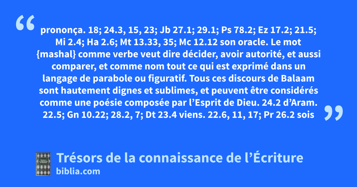 prononça. 18; 24.3, 15, 23; Jb 27.1; 29.1; Ps 78.2; Ez 17.2; 21.5; Mi 2.4; Ha 2.6; Mt 13.33, 35; Mc 12.12 son oracle. Le mot {mashal} comme verbe veut dire décider, avoir autorité, et aussi comparer, et comme nom tout ce qui est exprimé dans un langage de parabole ou figuratif. Tous ces discours de Balaam sont hautement dignes et sublimes, et peuvent être considérés comme une poésie composée par l’Esprit de Dieu. 24.2 d’Aram. 22.5; Gn 10.22; 28.2, 7; Dt 23.4 viens. 22.6, 11, 17; Pr 26.2 sois irrité contre Israël. 1S 17.10, 25, 26, 36, 45; 2S 21.21; 23.9
