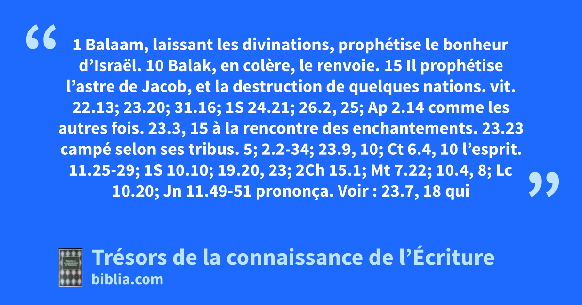 1 Balaam, laissant les divinations, prophétise le bonheur d’Israël. 10 Balak, en colère, le renvoie. 15 Il prophétise l’astre de Jacob, et la destruction de quelques nations.